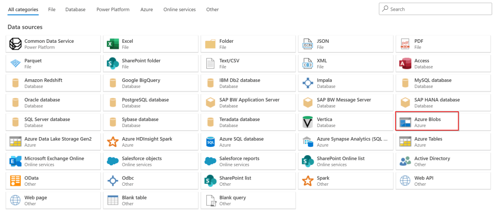 Step 4: Now, we see a list of connectors that can be used. As we are online sales data, we’ll select the ‘Azure Blob Storage’ option from the available sources.