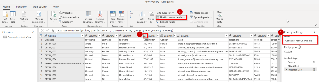 Step 6: We’ll be able to see the preview of data.As we used a CSV file to ingest the data (instead of on Common Data Service), we’ll have to tell the system about the column names and data types.