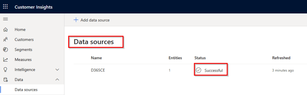 Step 10: Click Save to complete this process. Once completed, we’ll have a successful data source and a new entity defined in CI which will have the Contact information from Dynamics 365 CE.