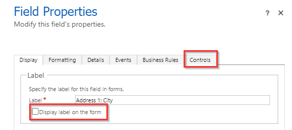 Uncheck the “Display label on the form” option and click on ‘Controls’ tab