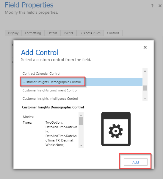 Step 5: Look for the “Customer Insights Demographic Control” from the available custom controls and select Add.