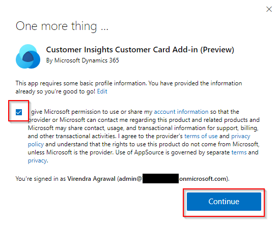 Step 2: When prompted, we will need to sign in with our admin credentials for the Dynamics 365 app to install the solution, accept the terms & conditions and click continue.