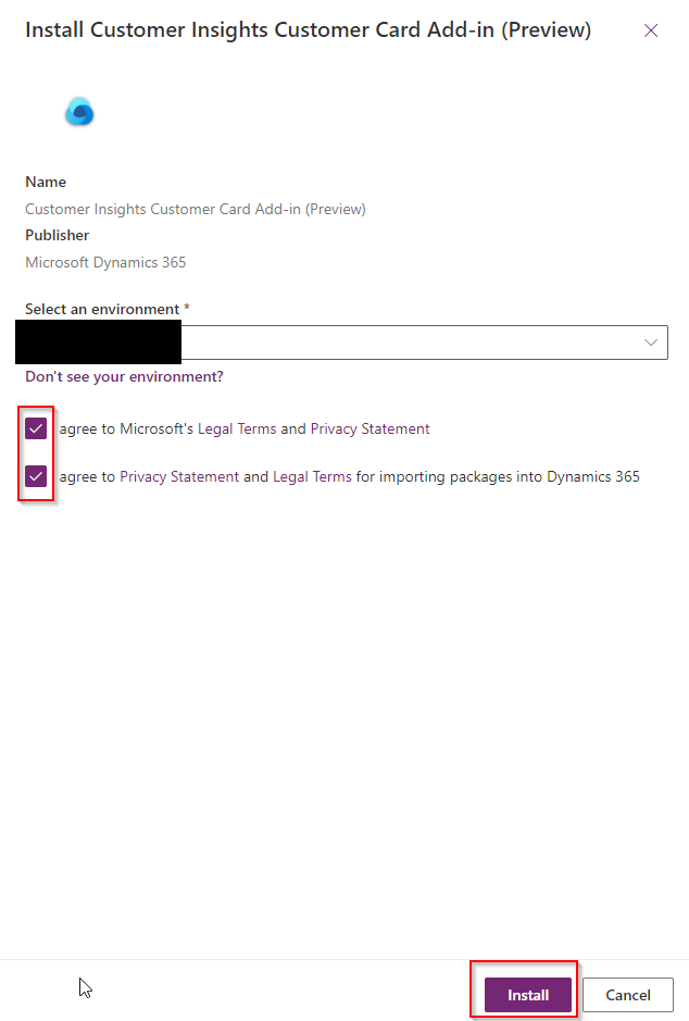 Step 2: On the Power Platform Admin Center page, select the environment, accept the terms & click on the Install button.